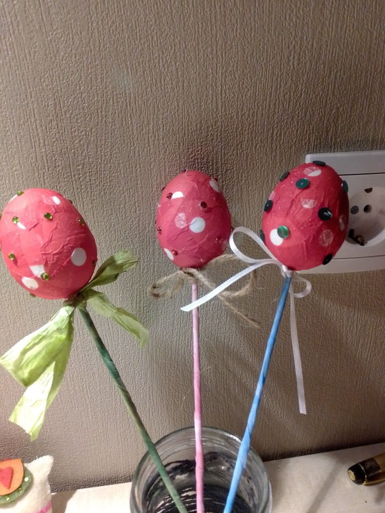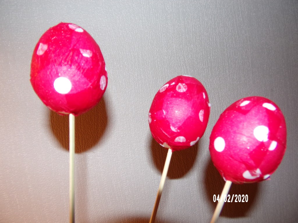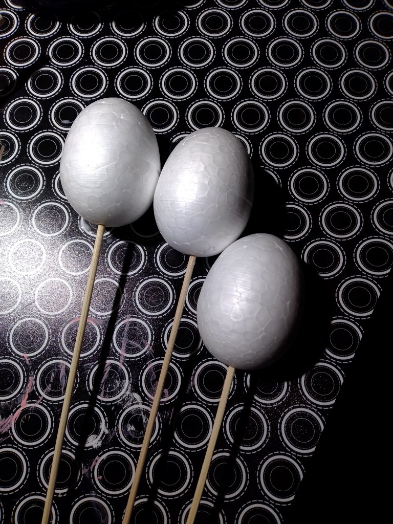 Vor einer Weile habe ich ja schon mit den Osterbsateleien angefangen. Ich nutze dafür gern die Tage, an denen das Wetter nicht so toll ist. Hier ist eine relativ einfache, aber sehr dekorative Idee. Ich habe 3 Styroporeier genommen und auf einen Schaschlikspieß gesteckt. Dann habe ich sie mit Serviettentechnik verziert. Du könntest sie auch einfach z.Bsp. mit Acrylfarbe anmalen. Nachdem sie getrocknet waren, habe ich sie noch mit Glitzersteinen verziert. Den Schaschlikspieß mit Maskingtape ummantelt und eine Schleife am Einstichloch und schon ist die Deko fertig.