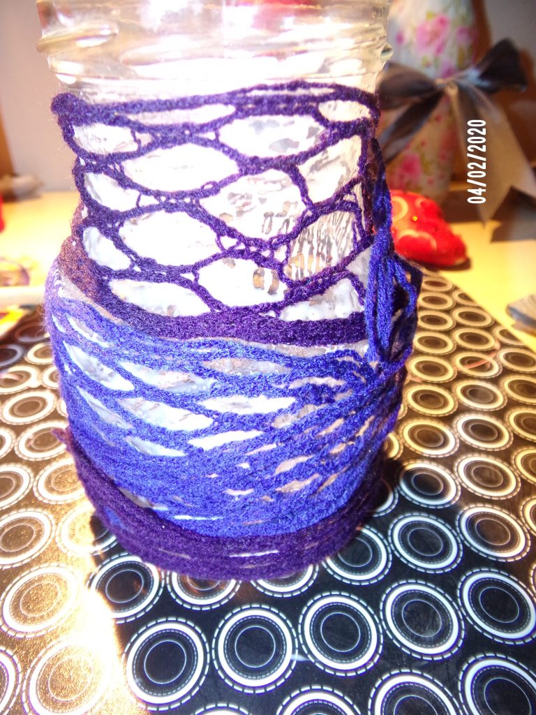 so manches altes Glas kannst Du mit ein paar Kleinigkeiten und ein paar Ideen in ein tolles Windlicht verwandeln. Ich habe hier mal ein maritimes Windlicht gemacht. Dafür habe ich ein altes Joghurt – Einwegglas genommen und habe es mit Wolle beklebt. Die Wolle war ein Superschnäppchen und erst im Nachhinein habe ich gesehen, daß sie wie ein Netz aussieht, wenn man sie auseinander macht. Zum ankleben habe ich das glas mit Bastelleim eingepinselt, die Wolle raufgelegt und trocknen lassen. Dann habe ich „Seeglas“ und Muscheln raufgeklebt mit Heißkleber und schon ist es fertig.