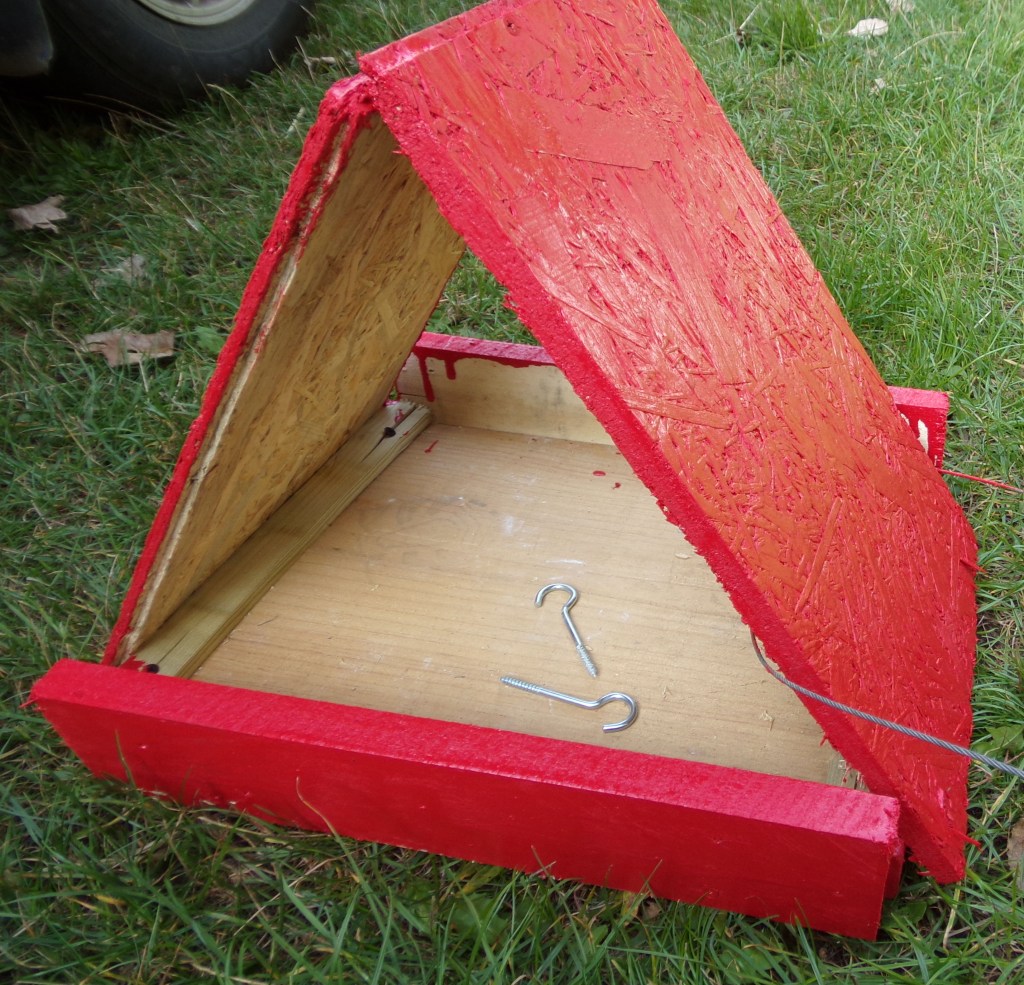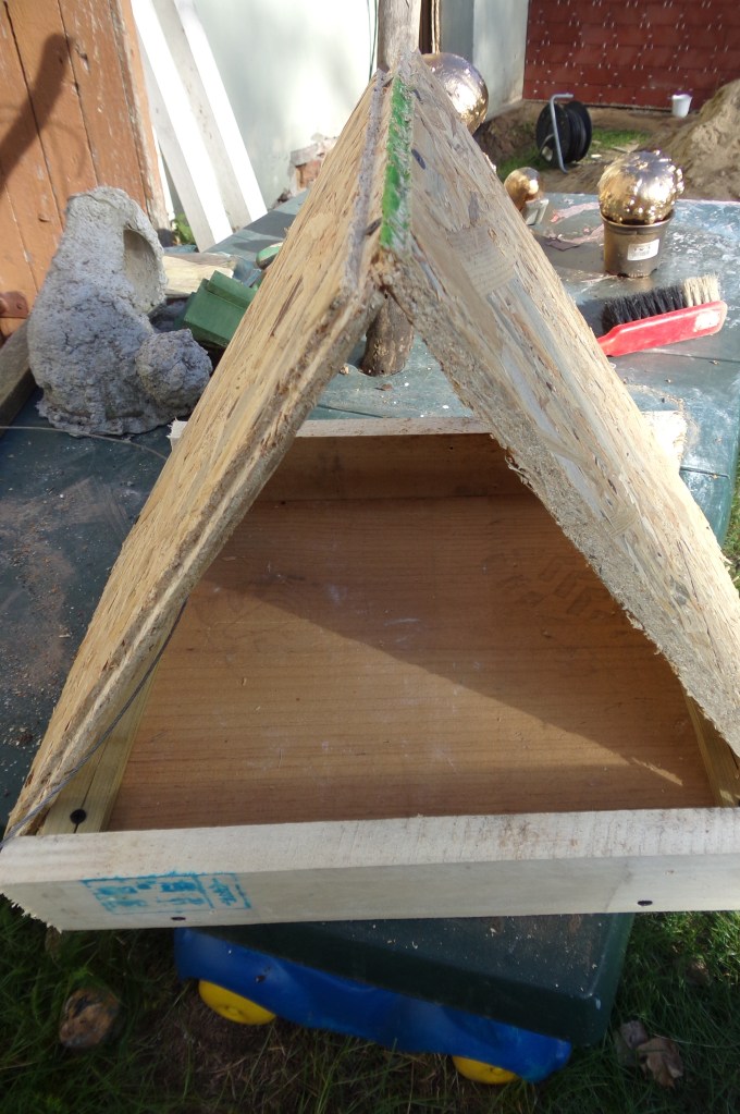 Nach 10 Jahren ist nun unser selbstgebautes Vogelfutterhaus auseinandergefallen. Also mußte ein neues her. Da wir immer irgendwelche Holzreste im Schuppen rumzuliegen haben, war das zum Glück keine so schwierige Aufgabe. Also habe ich alles passend zugesägt, miteinander verschraubt und lackiert. So konnte ich gleich noch den Lackrest aufbrauchen. Die zwei Haken habe ich noch vorne reingeschraubt. Da werden dann immer die Meisenkugeln angehangen.