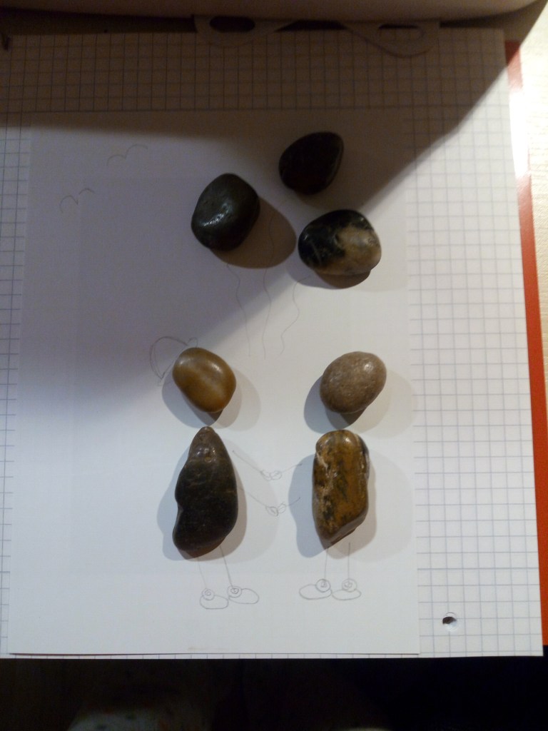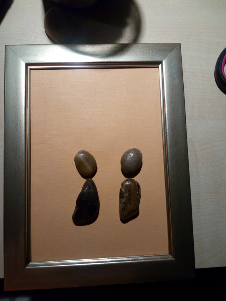 Kieselsteine sind `ne tolle Sache und mit ein bißchen Phantasie und Ideen lassen sich da kleine Kunstwerke zaubern. Bei diesem hier habe ich einfach einen leeren Bilderrahmen genommen, ein farbiges Blatt Tonkarton zurecht geschnitten und losgelegt. Ich habe erst probiert und Steine verschieden gelegt, bis es gepasst hat. Dann habe ich alles mit Heißkleber festgeklebt und den Rest mit schwarzem Filzstift „rangemalt“. Es hat riesig Spaß gemacht und ist auch echt toll geworden. Bestimmt wird da noch das eine oder andere entstehen.