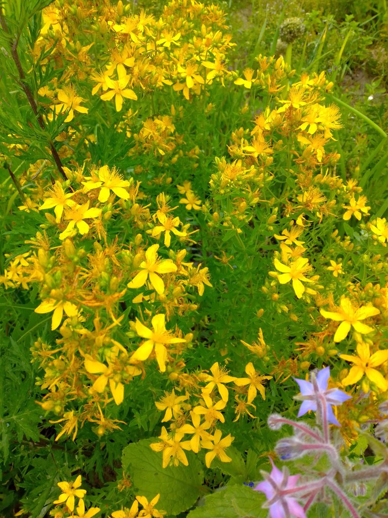 Um den 21. Juni rum ernte ich immer die Blüten vom Johanniskraut. Möglichst an einem trockenen Tag. Ich sammle ein kleines Glas voll. Und auch wenn es immer ein kleines Glas ist, dauert es eine gefühlte Ewigkeit, bis es voll ist 🙂 Dann fülle ich es mit Öl auf und lasse es auf meiner Fensterbank ca. 4 – 6 Wochen ziehen. Bis sich das Öl schön rot gefärbt hat. Daher kommt auch der Name Rotöl. Dann absieben und in Fläschchen füllen. Wir haben immer einen Vorrat davon im Haus. Wir benutzen es zum Einreiben bei Gelenkschmerzen, Rückenschmerzen (die meinen Mann manchmal plagen) oder auch Muskelkater. Man kann dafür jedes beliebige Öl je nach Vorliebe benutzen, ich nehme immer Sonnenblumenöl, weil es ziemlich neutral ist.