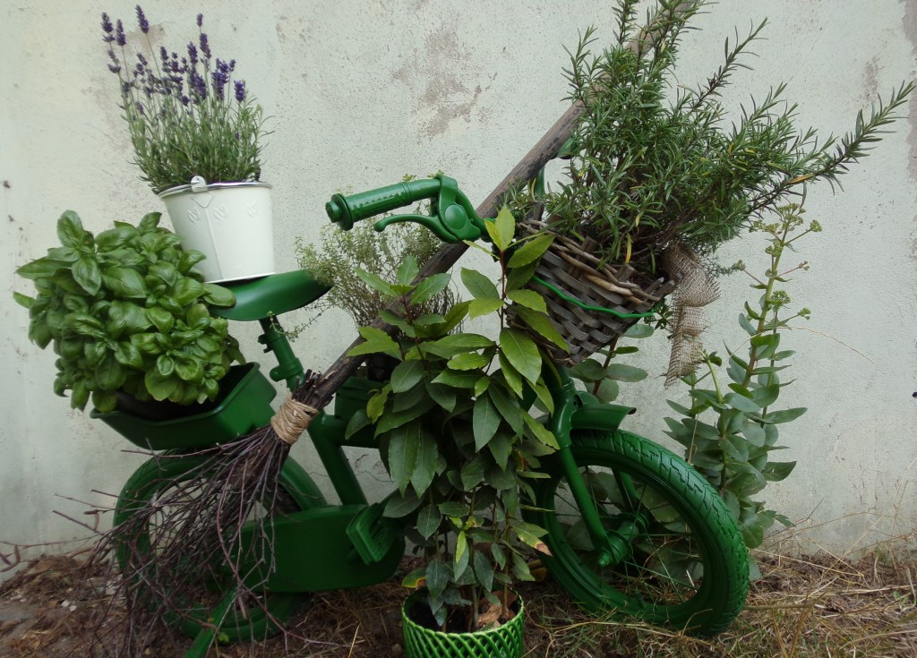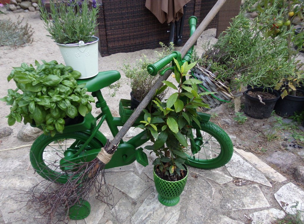 Die Kinder werden größer und dann gibt es viele Dinge die nicht mehr passen oder auch einfach nicht mehr benutzt werden. Fahrräder sind z.Bsp. so ein Fall. Irgendwann sind sie einfach zu klein. Und was nun? Wegwerfen ist immer die letzte Alternative. Ich habe daraus ein kleines „Hexen – Kräuter – Fahrrad“ gemacht. Es hat seinen ganz eigenen Charme.