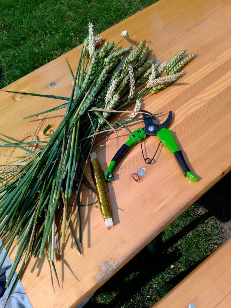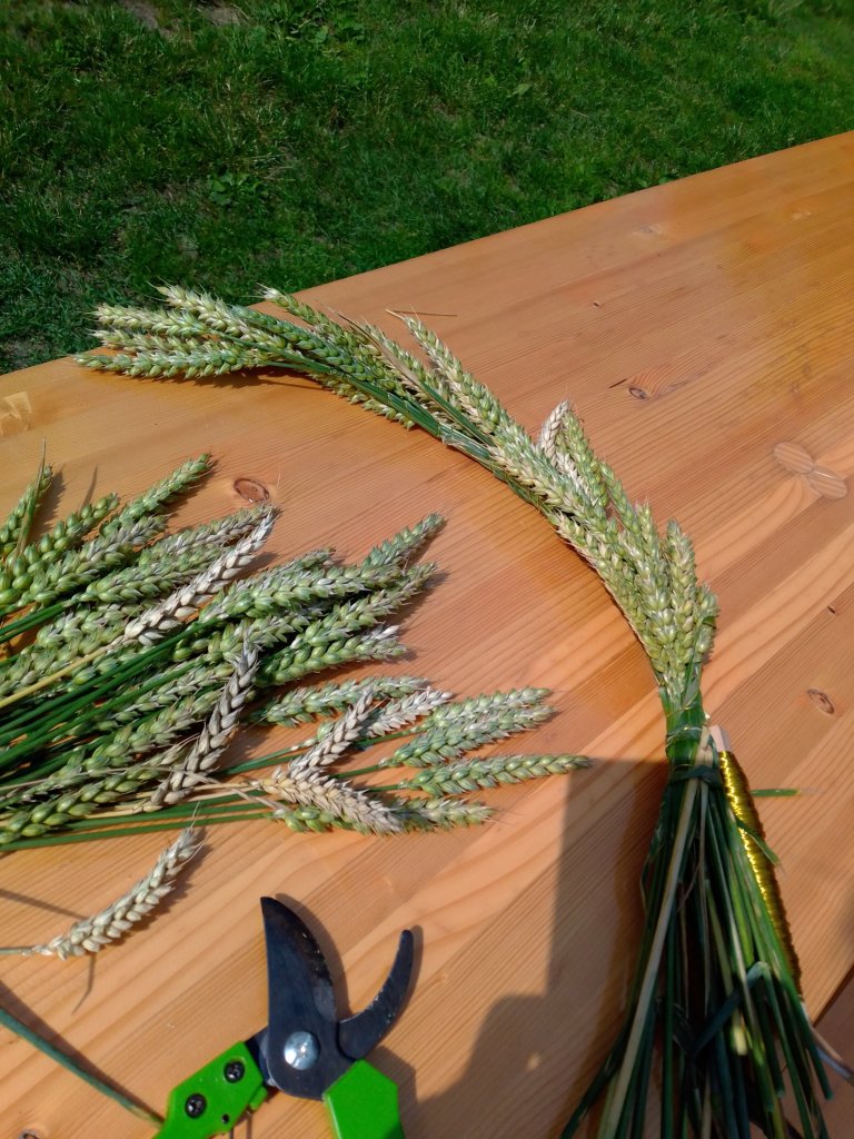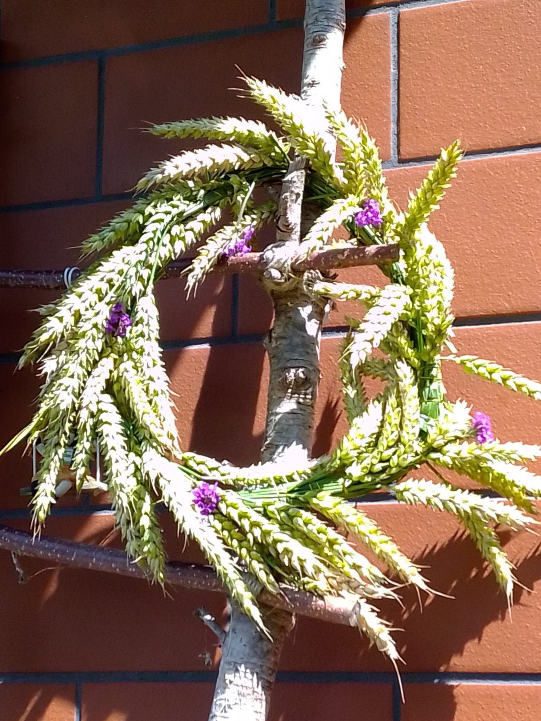 Ringsrum bei uns wird das Getreide nun langsam goldig und sieht wunderschön aus. Da wurde es Zeit auch die Deko zu aktualisieren und somit habe ich ein paar Ähren vom Rand geschnitten und sie zu einem Kranz gebunden. Das Ganze hängt nun an der selbstgemachten Dekoleiter vor`m Haus. Für diese Jahreszeit eine wunderschön und passend.
