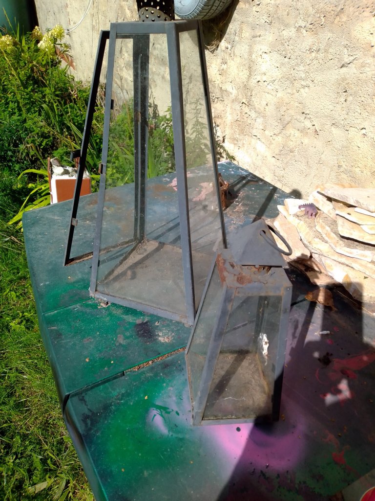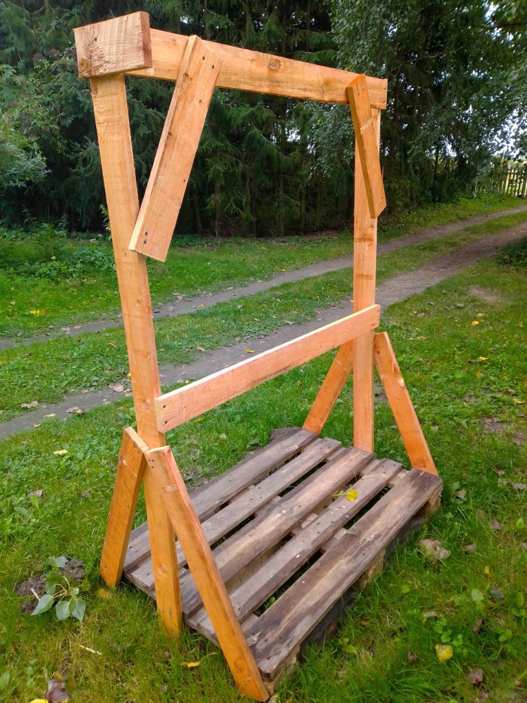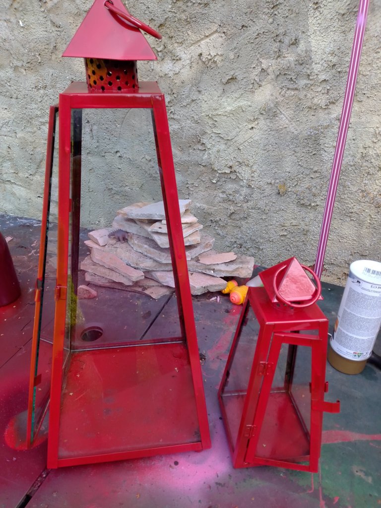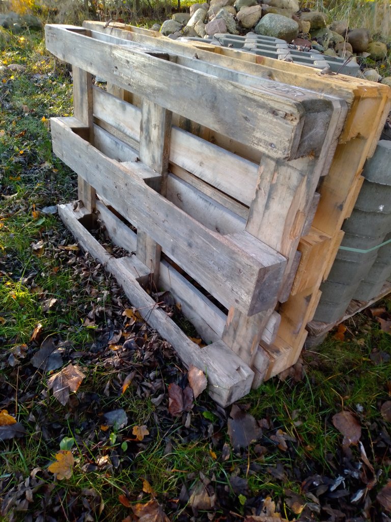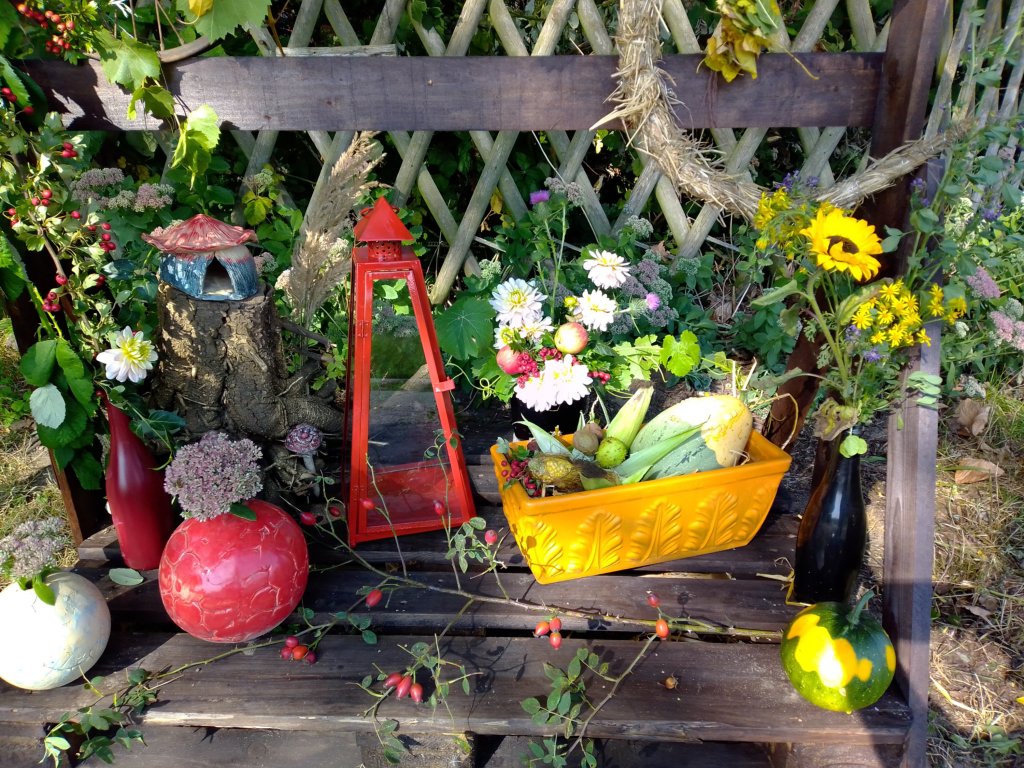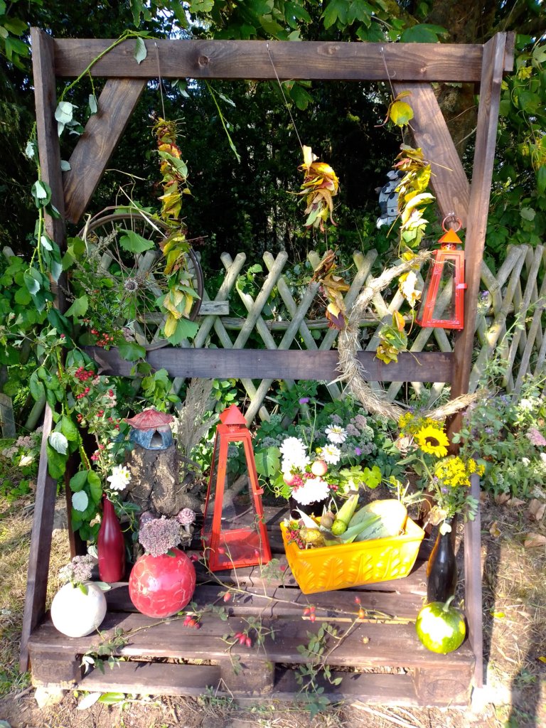Manchmal bekommen wir Dinge auf Paletten geliefert. Und manche Paletten haben eine „spezielle“ Form. Diese hier haben wir nun umfunktioniert und in unseren Eingangsbereich gestellt. Zuvor wurde sie mit Holzlasur gestrichen. Da jetzt der Herbst da ist, ist auch die Deko entsprechend. Wir haben Girlanden aus Blättern mit den Kindern gefädelt, dazu die alten nicht mehr so hübschen Laternen neu lackiert und auch zwei Sektflaschen haben eine Lackschicht erhalten und dienen jetzt als Vasen. Dazu ein kleines Blumengesteck und eine gebundene Mondsichel aus Heu. Außerdem hat der alte Baumstumpf einen Goldschimmer verpasst bekommen. Naja und dann kommt ja bald Halloween….