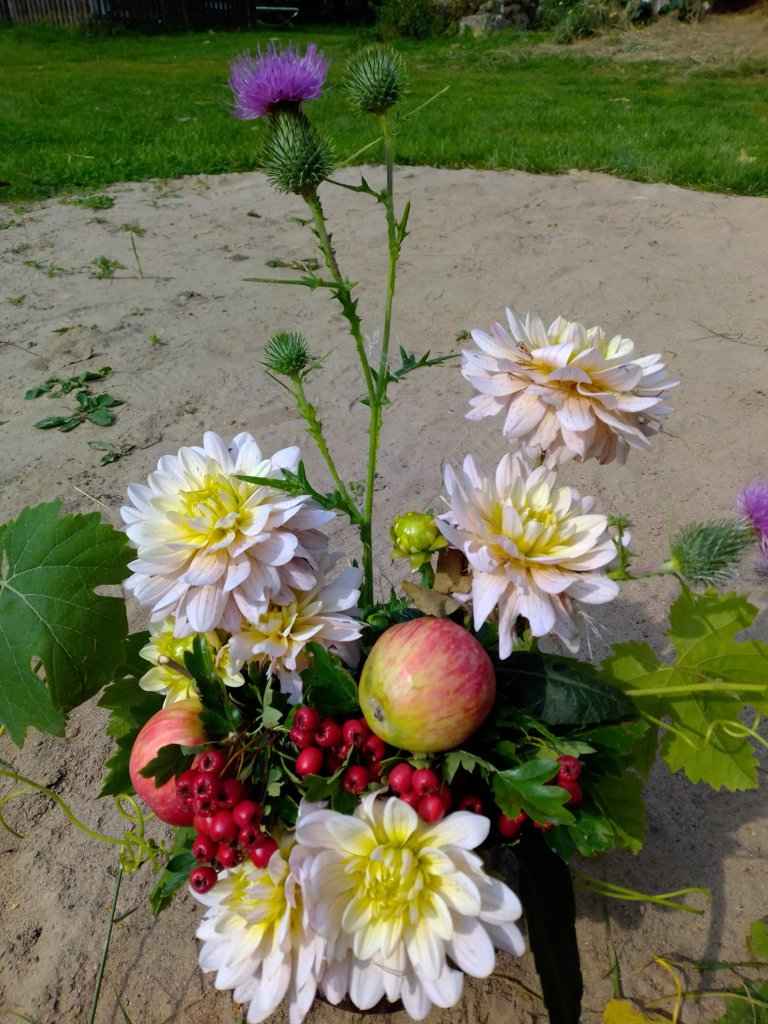 Da ich gerne dekoriere und ein recht kreativer Mensch bin, finde ich zu jeder Jahreszeit auch was, was gestaltet werden kann. Bei uns steht immer ein kleines Sträußchen oder Gesteck auf dem Tisch. Und diesmal habe ich einen Zierkürbis als Grundlage genommen. Ich habe ihn ausgehöhlt und mit Steckmasse gefüllt. Anschließend eine Kerze angedrahtet und in die Steckmasse gesteckt und einiges, was ich auf unserem Grundstück an Herbstblumen bzw. Beeren finden konnte mit eingesteckt.