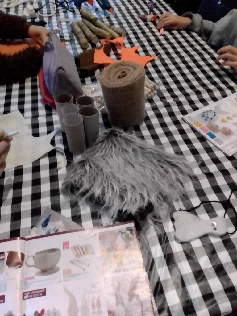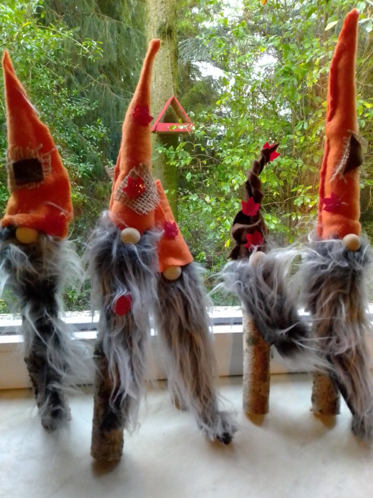 Nun war das Wetter ja endlich mal so, daß man wieder drinnen basteln konnte. 🙂 Und das wurde auch gleich genutzt. Ich habe einen alten Birkenast in einzelne Stücke gesägt und dann haben wir mit ein bißchen Filz und Plüschstoff (für den Bart) ein paar tolle Herbstwichtel gebastelt.