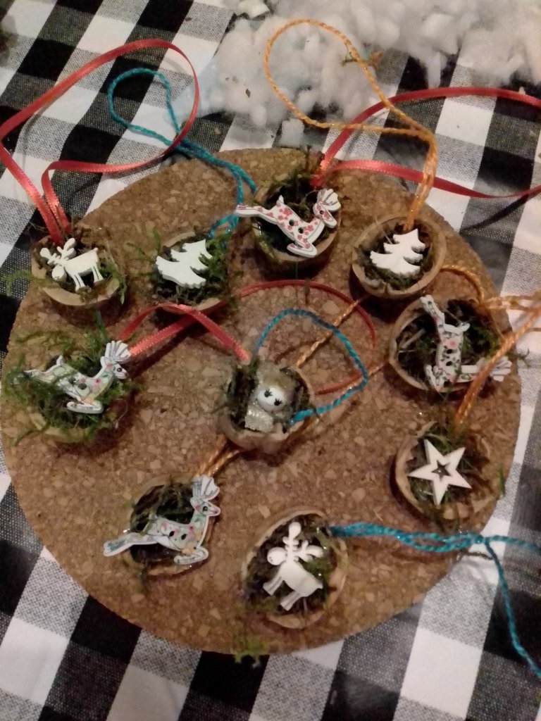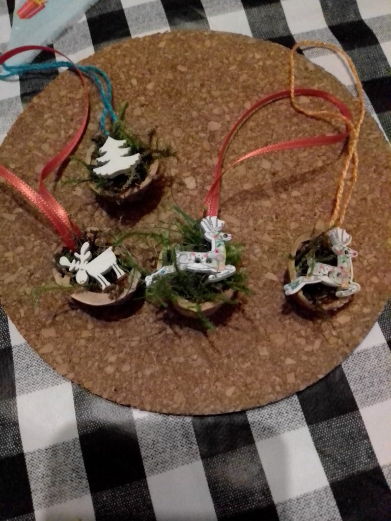 Unser Baum trägt, wie fast alle Jahre immer reichlich Nüsse. Und auch die Schalen lassen sich ja vielseitig nutzen. Wir nutzen die Schalen z. Bsp. um unseren Kamin an zu machen. Aber manchmal ebend auch zum Basteln. So haben wir diesmal die Walnusshälften, die ganz geblieben sind mit etwas Moos gefüllt und ein Bändchen eingeklebt. Anschließend noch ein Mini – Figürchen eingeklebt und schon ist ein weihnachtlicher Anhänger fertig. Wir haben sie an einem Tannenzweig zu hängen. Man könnte sie aber z. Bsp. auch als Geschenkanhänger benutzen.
