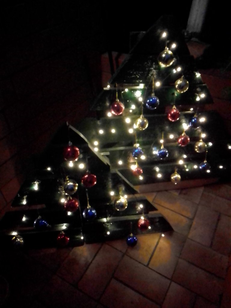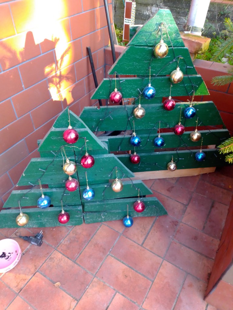 Aus Palletten kann man viele tolle Sachen machen. Wir haben es hier mal mit Weihnachtsbäume für draussen probiert. Dazu habe ich die Palletten einmal diagonal zersägt und dann wie einen Weihnachtsbaum zusammengeschraubt. Anschließend schön dunkelgrün lackiert und trocknen lassen. Dann habe ich in unregelmäßigen Abständen Schrauben eingedreht und daran dann eine Lichterkette und Kugeln aus Kunststoff, die nicht mehr ganz so super (zumindets für drinnen) waren befestigt bzw. angehangen. Fertig ist die tolle Deko.