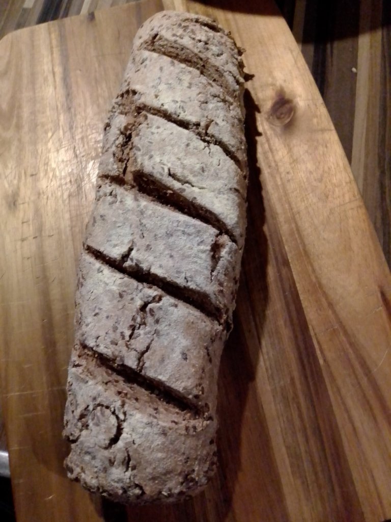 Dazu einen Brotteig formen, einschneiden, mit Wasser besprühen und bei 230° in den Backofen schieben. Den Backofen noch mit Wasser einsprühen und die Temperatur auf 180 – 200° runterstellen. 30 – 45 Minuten backen.