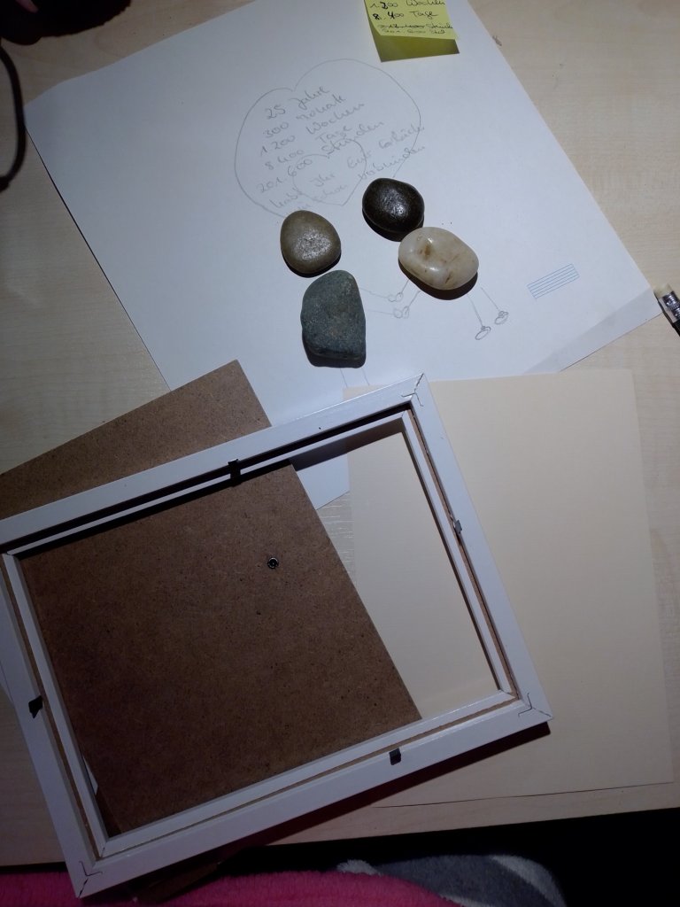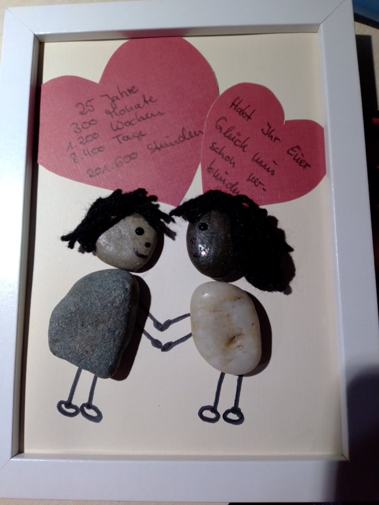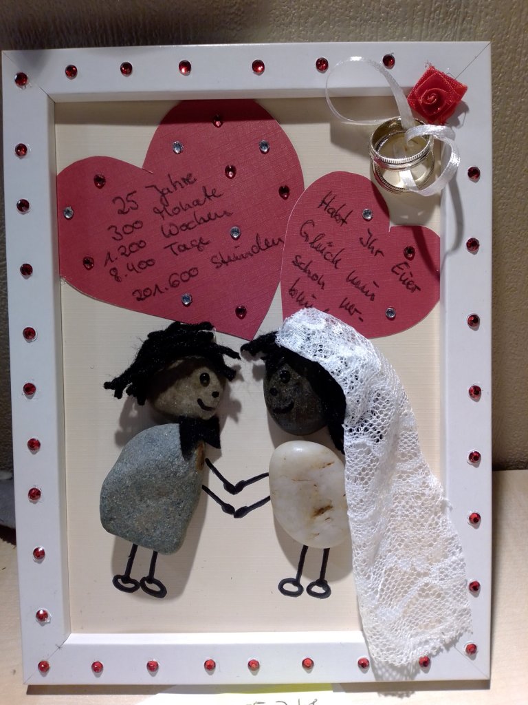 vor ein paar Tagen gab`s in unserem Bekanntenkreis Silberhochzeit. Da habe ich mich ein bißchen kreativ betätigt und was gebastelt. Ich hatte bereits vor einiger Zeit ein Bild mit Kiesel gemacht und habe entsprechend der Silberhochzeit nochmal eins gebastelt. Ich mache gerne was originelles (nicht kaufbares 🙂