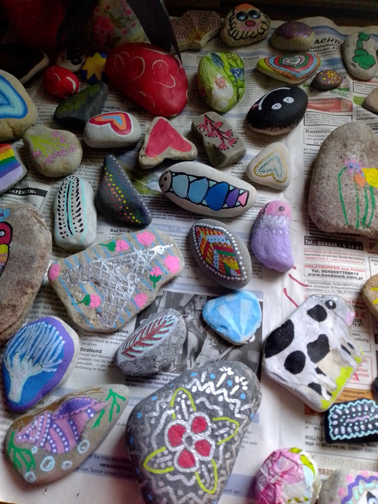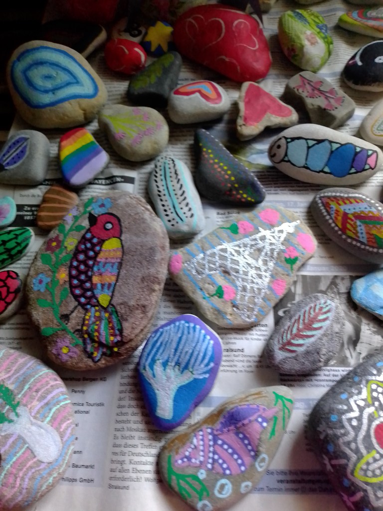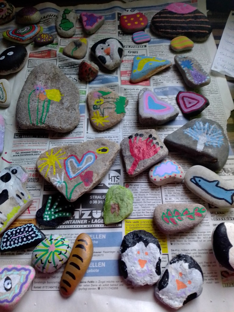 Zu Hause angekommen, haben wir die Steine sauber gemacht, Farben rausgesucht und der Phantasie freien Lauf gelassen. Und mit viel Liebe und Spaß an der Sache sind ganz tolle Sachen entstanden.