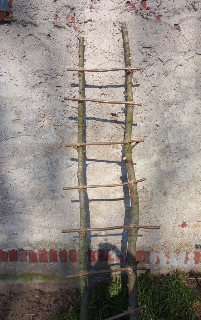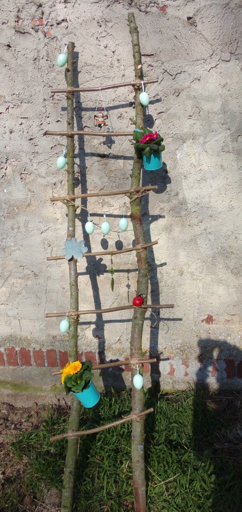Eine recht einfache, aber echt dekorative Bastelarbeit ist diese Dekoleiter. Dafür habe ich einfach zwei eingermaßen gerade Äste genommen und sie in gewünschter Länge zugesägt. Die Sprossen machen sich am besten aus Haselnusszweigen, da diese recht gerade wachsen. Dann habe ich die Sprossen mit Juteband an den Ästen festgebunden und schon ist das Ganze fertig zum Dekorieren. Das Material ist bis auf das Band, völlig kostenlos. Und man kann diese Deko je nach Jahreszeit oder Anlaß immer wieder neu gestalten.