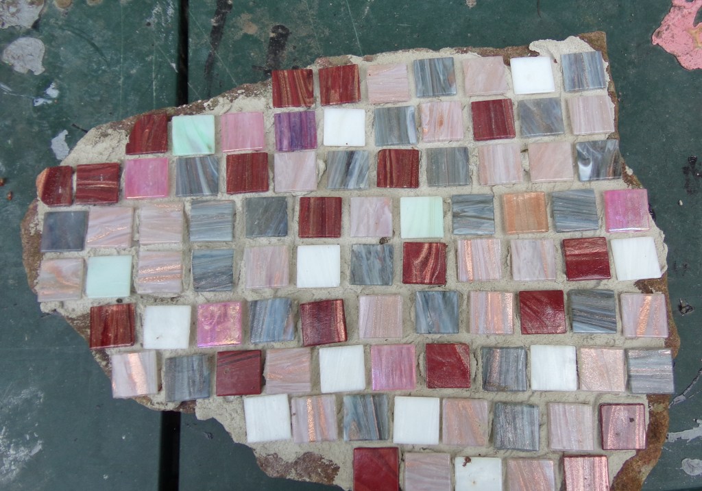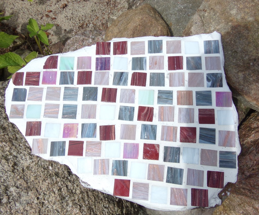 Vor einiger Zeit hatte ich einen schönen flachen Naturstein in der Hand. Der hat sich geradzu angeboten für Fliesenmosaik. Jetzt wird er bei schönen Wetter gerne draußen als Deko oder Kerzenunterlage mit auf den Tisch gelegt.