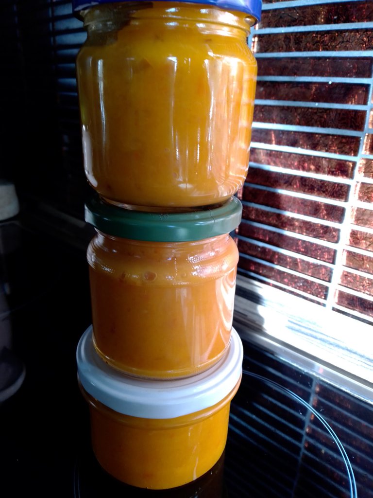 Da wir dieses Jahr viele von den leckeren Hokkaidos haben, wollte ich auch mal was einmachen für den Winter. Da fiel mir dieses Rezept in die Hände und es hat sich wirklich gelohnt. Dafür brauchst Du einen Hokkaido, 2 große Tomaten, 2 Zwiebeln und 3 Knoblauchzehen. Das wird alles geputzt und in Würfel geschnitten. Dann erhitzt Du etwas Olivenöl in einem Topf und gibst die Zwiebeln und den Knoblauch dazu. Außerdem noch 1 kleingeschnittene Chilischote ohne Kerne, 4 Nelken, 2 Lorbeerblätter und 4EL Agavendicksaft dazu und schmorst es etwas an. Dann das Geschnittene Gemüse dazu und etwas Salz sowie 4 EL Essig. Alles pürieren und heiß in Gläser füllen.