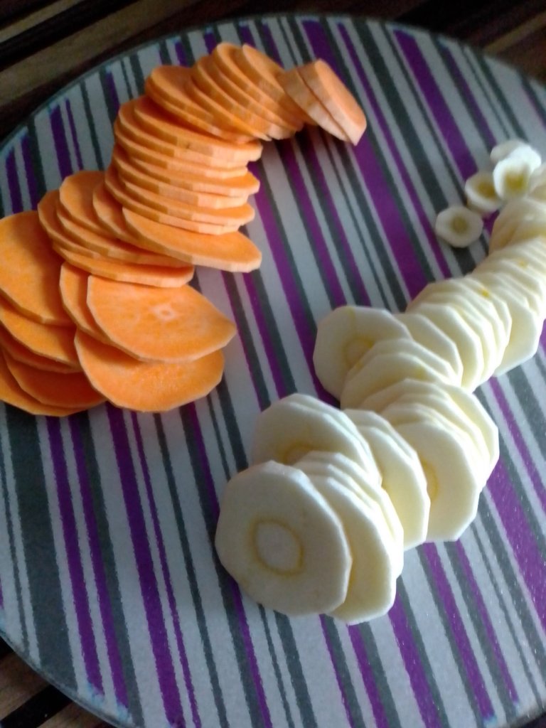 Ich habe Süßkartoffel und Pastinake genommen. Du mußt sie in ganz feine Scheiben schneiden oder alternativ mit entsprechenden Gerätschaften in Scheiben hobeln.
