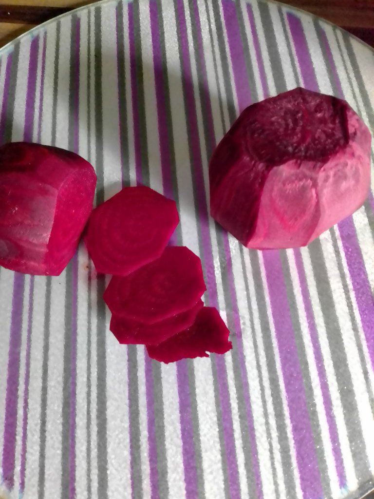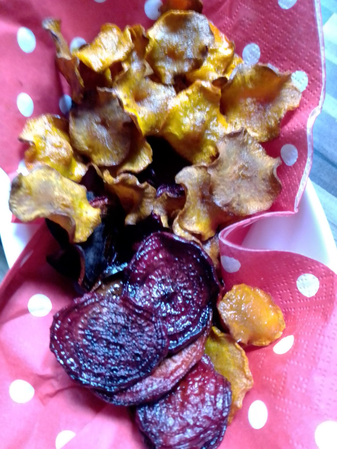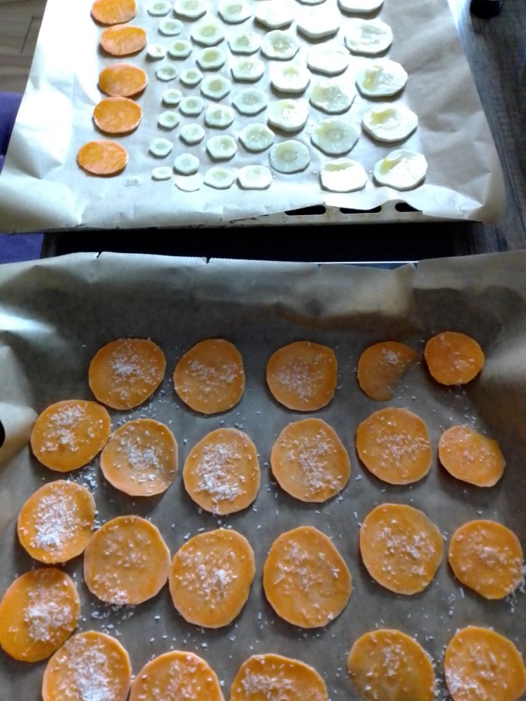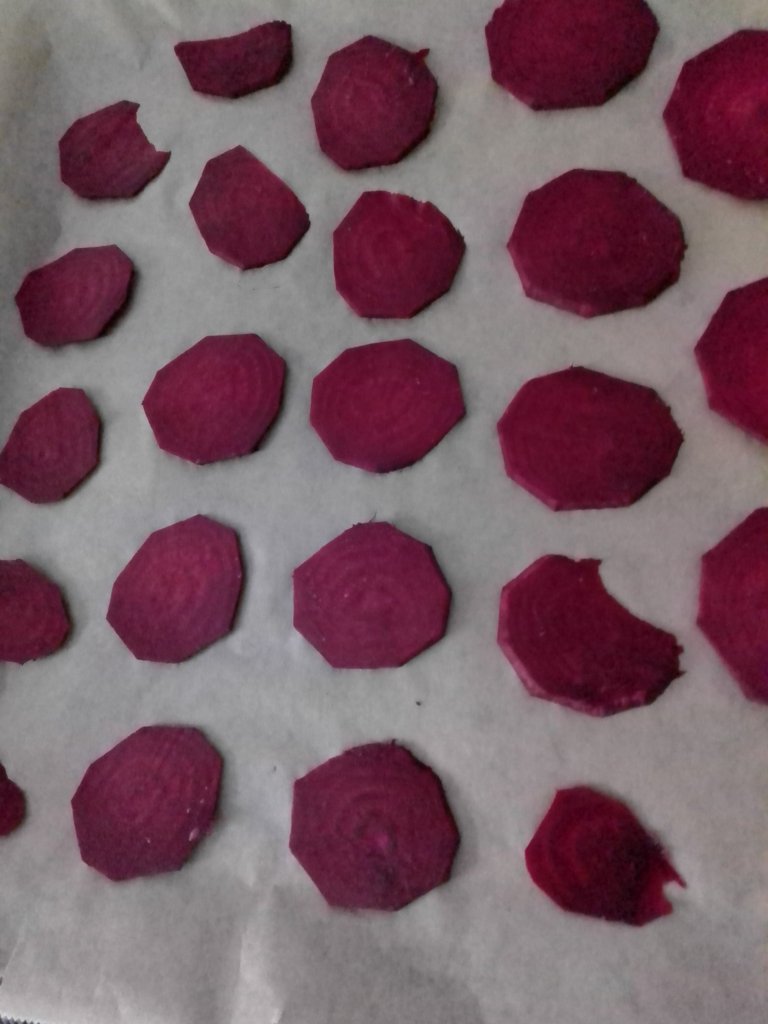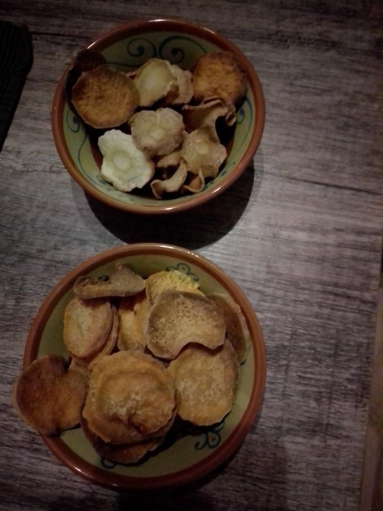 Auch Gemüsechips haben wir mal wieder gemacht. Diesmal haben wir unseren roten Bete und Möhren genommen. Die roten Bete haben wir mit Öl und Salz gewürzt und die Möhren mit Öl und Curry. Alles im Backofen bei 50° lassen, bis es Chips sind. Immer zwischendurch die Tür öffnen, damit die Feuchtigkeit entweichen kann. Und dann möglichst bald essen, da sie bei uns nach einer Weile leider wieder weich geworden sind. Schmecken tun sie aber dann trotzdem noch.