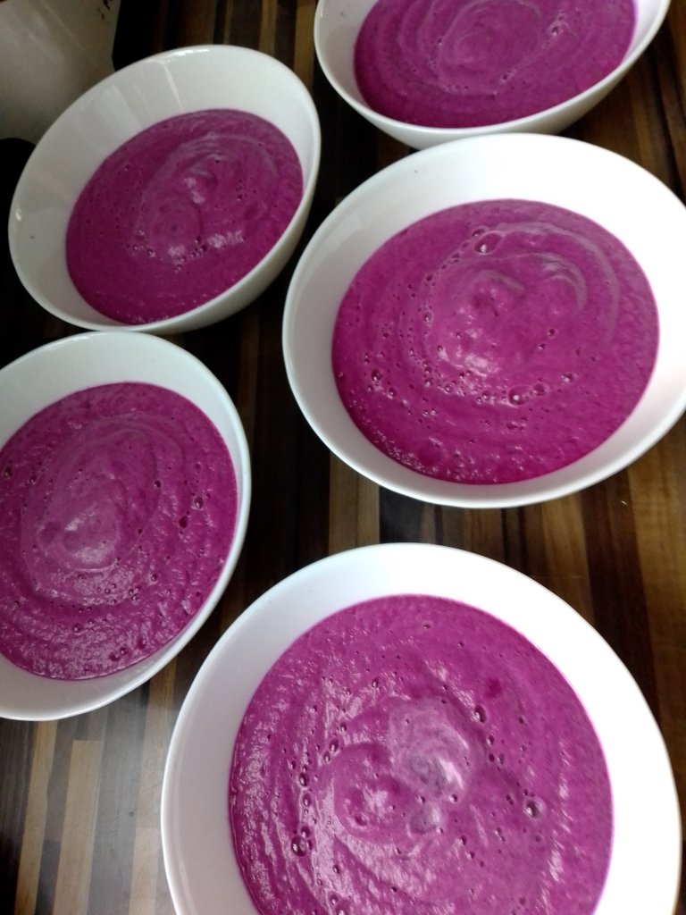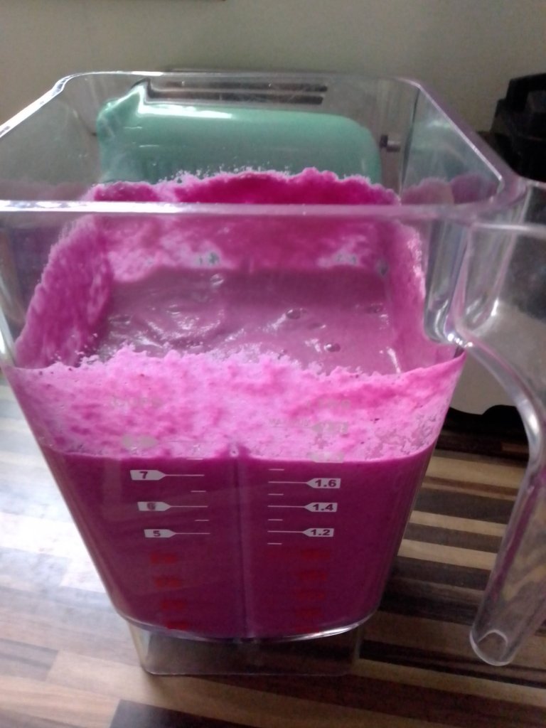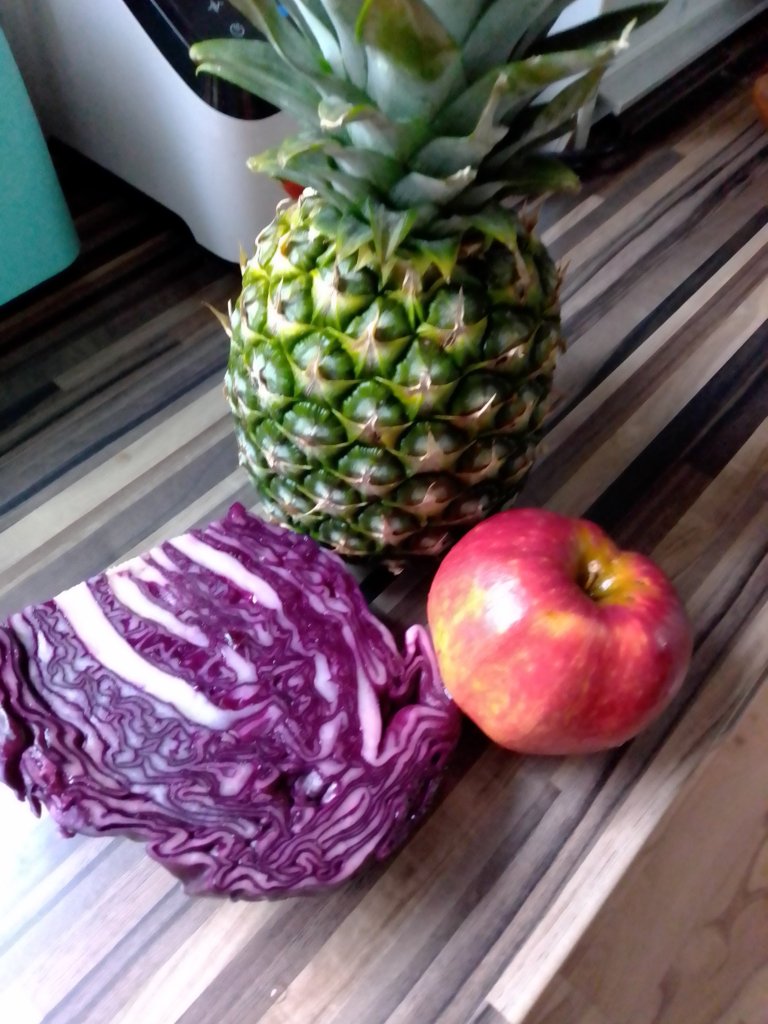 Smoothie sind eine tolle Sache. Man kann wahnsinnig viele Vitaminchen mit einmal zu sich nehmen. Das, was alles in einem Smoothie drin ist, würde ich so sonst nie auf einmal zu mir nehmen. Und sie sind so vielfältig und variabel, daß es ein unendliche Auswahl gibt. Außerdem ist es eine tolle Gelegenheit auch Kinder mit den entsprechenden Vitaminen zu versorgen. Diesmal haben wir mal einen roten Smoothie gemacht. Die Zutaten haben wir wie auf dem Bild zu sehen ist, genommen. Nur die Menge haben wir etwas verändert. Wir haben 1 Ananas, 2 Äpfel und ein kleineres Stück Rotkohl genommen (etwa die Hälfte). Dazu kommen noch etwas Zimt und gemahlene Nelken. Und Wasser. Wasser nach Belieben, je nachdem, ob der Smoothie eher zum Trinken oder zum Löffeln sein soll.