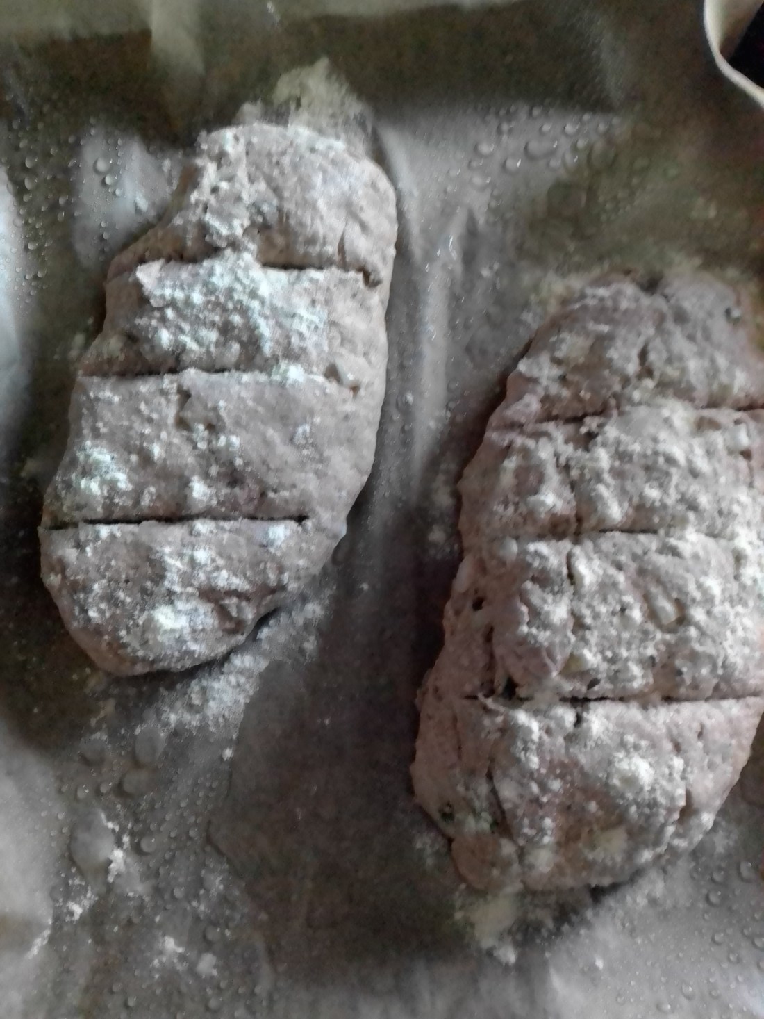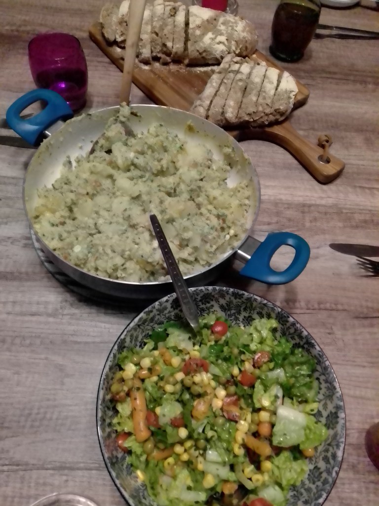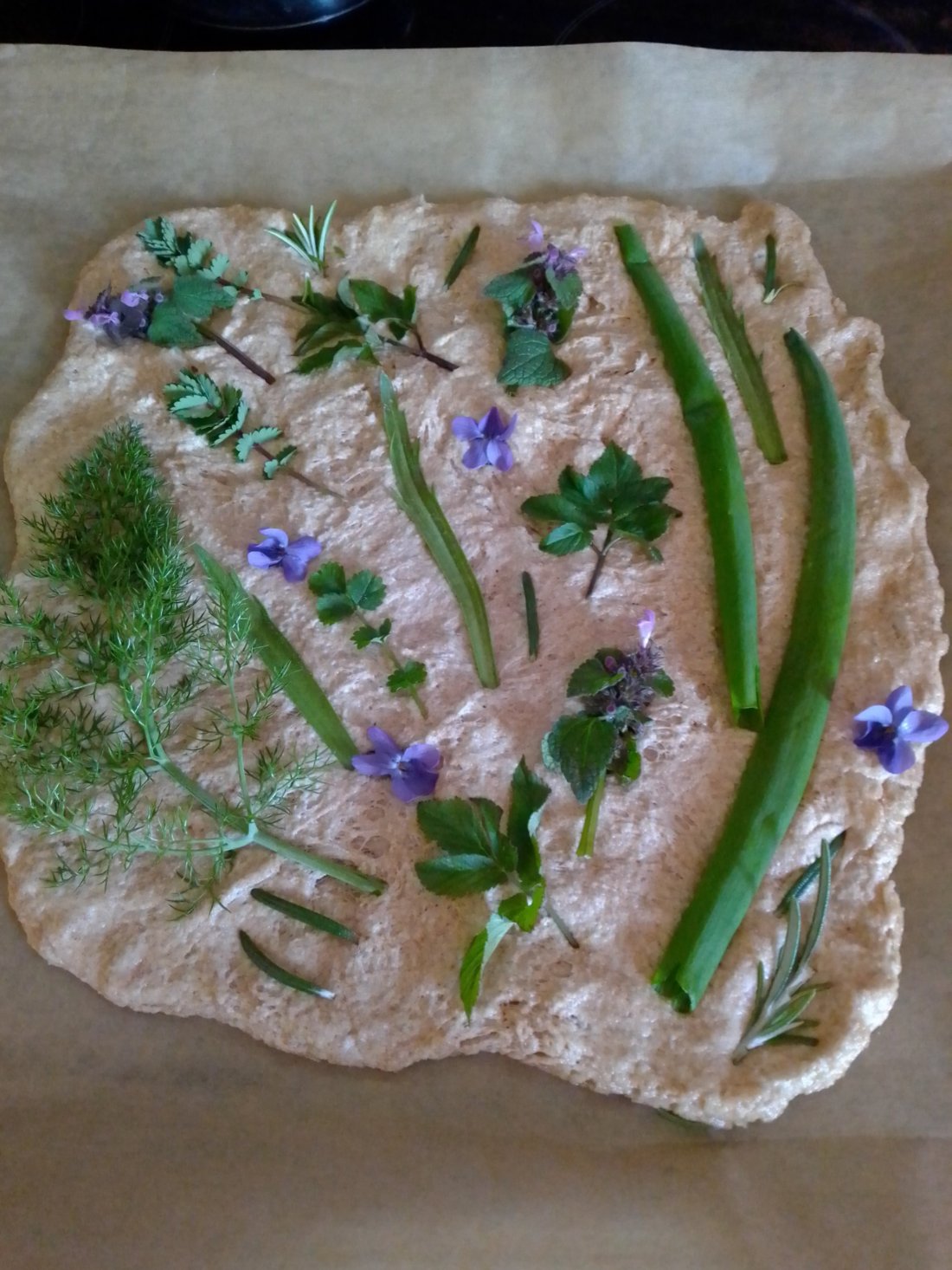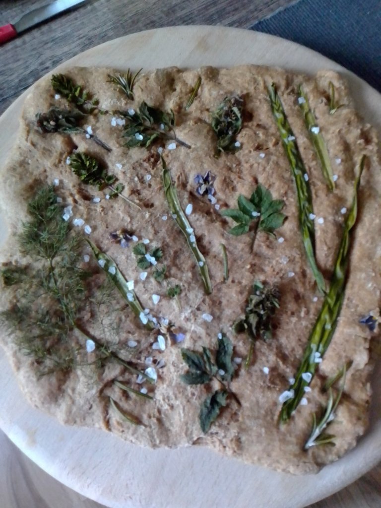 Hier hab‘ ich 500g Rotkornweizen ( man kann aber auch anderes Getreide nehmen) gemahlen und dann mit Salz, Hefe, etwas Zucker und Öl zusammen mit lauwarmem Wasser verknetet. Dann ca. 2 Stunden gehen lassen und anschließend auf einem Blech in eine etwa rechteckige Form bringen mit Olivenöl bestreichen und mit Kräutern und / oder Gemüse dekorieren. Anschließend für ca. 20 – 30 Minuten bei 200° backen.