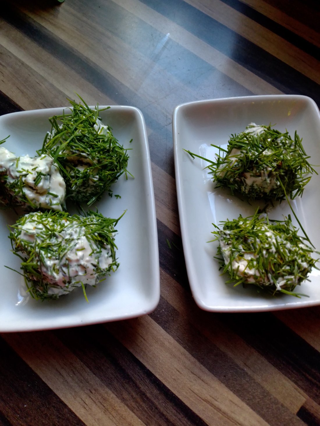Heute gab`s zum Brot mal was Neues. Ich habe Frischkäse mit Salz, Pfeffer und Curry gewürzt. Dann habe ich ein paar junge, frische Gierschblätter kleingeschnitten und mit unter den Frischkäse gemischt. Da unsere Lärchen gerade die ganz frischen Nadeln haben, habe ich ein paar gepflückt und auch kleingeschnitten. Nun aus dem Frischkäse kleine Kugeln formen (was gar nicht so einfach ist 🙂 und dann in den Lärchennadeln rollen. Sieht toll aus auf dem Tisch und ist mal was anderes.