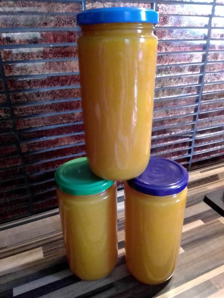 So, wenn das erledigt ist kann man alles schön weiterverarbeiten. Immer 1kg Mirabellenmus mit 500g Gelierzucker 2:1 und dann gibt`s viele leckere Variationen. Ich habe folgende Varianten genommen: Mirabellen – Vanille – Marmelade, Mirabellen – Marmelade mit Anis und Nelken, ganz einfache Mirbellenmarmelade, Mireabellen – Zimt – Marmelade und Mirabellen – Senf (Mirabellenmus mit etwas Essig, Zucker und gemahlenen Senfkörnern und etwas Salz und Pfeffer.