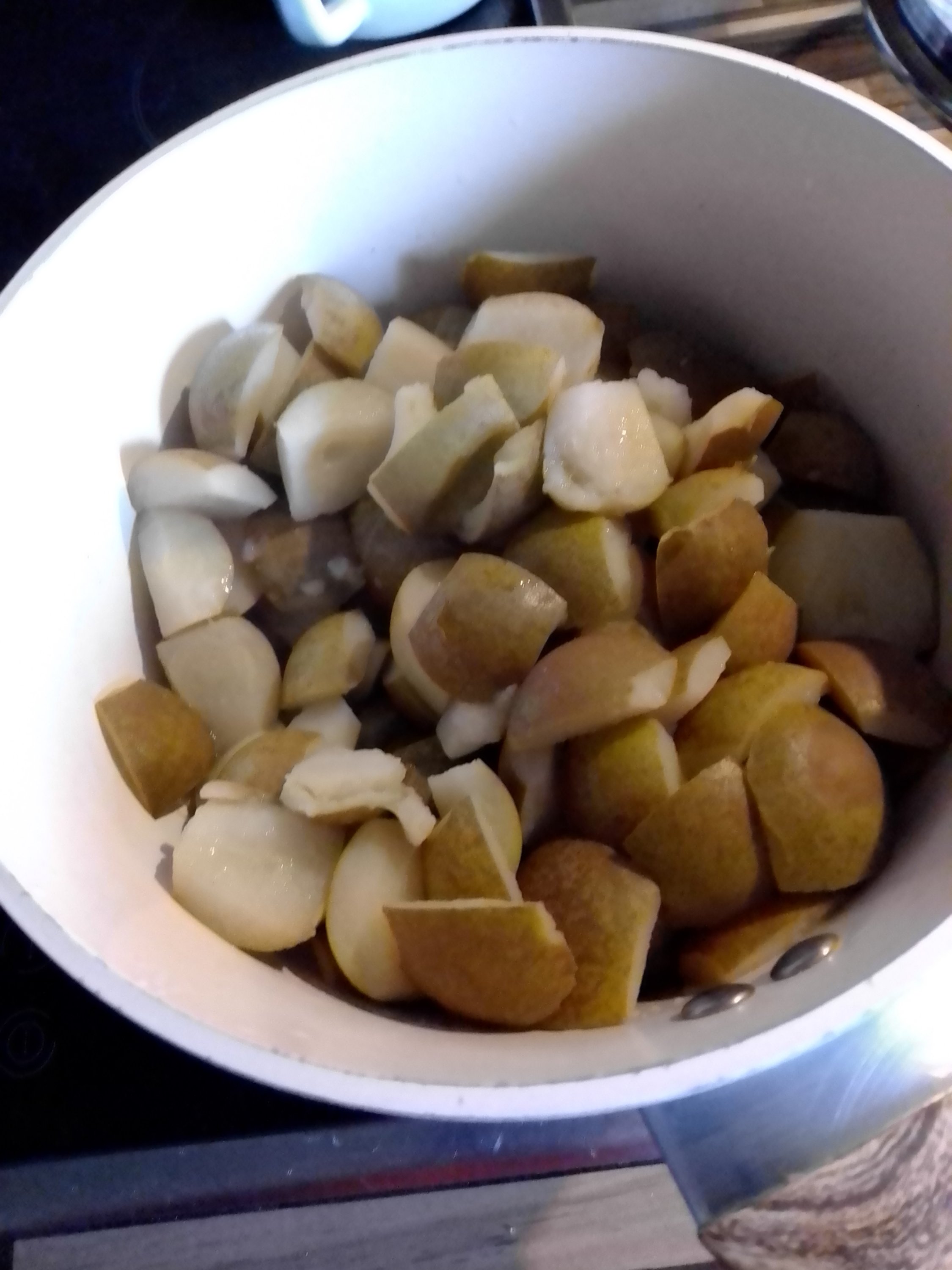 Dieses Jahr trägt unser junges Quittenbäumchen reichlich Früchte ebenso unsere uralten Bäume mit den kleinen Kochbirnen. Also was gibt’s da besseres zu tun als alles zu Leckereien zu verarbeiten. Für diese Marmelade habe ich 500 g Quitten und 500 g Birnen genommen. Alles entkernt und klein geschnitten aber nicht geschält. Dann mit etwas Wasser köcheln lassen bis es weich ist und pürieren. Jetzt 500 g Gelierzucker 2 : 1 einrühren, aufkochen, 3 Minuten kochen lassen und heiß in Gläser füllen. Sehr lecker….und auch einfach.