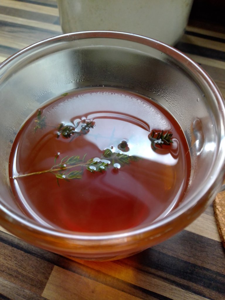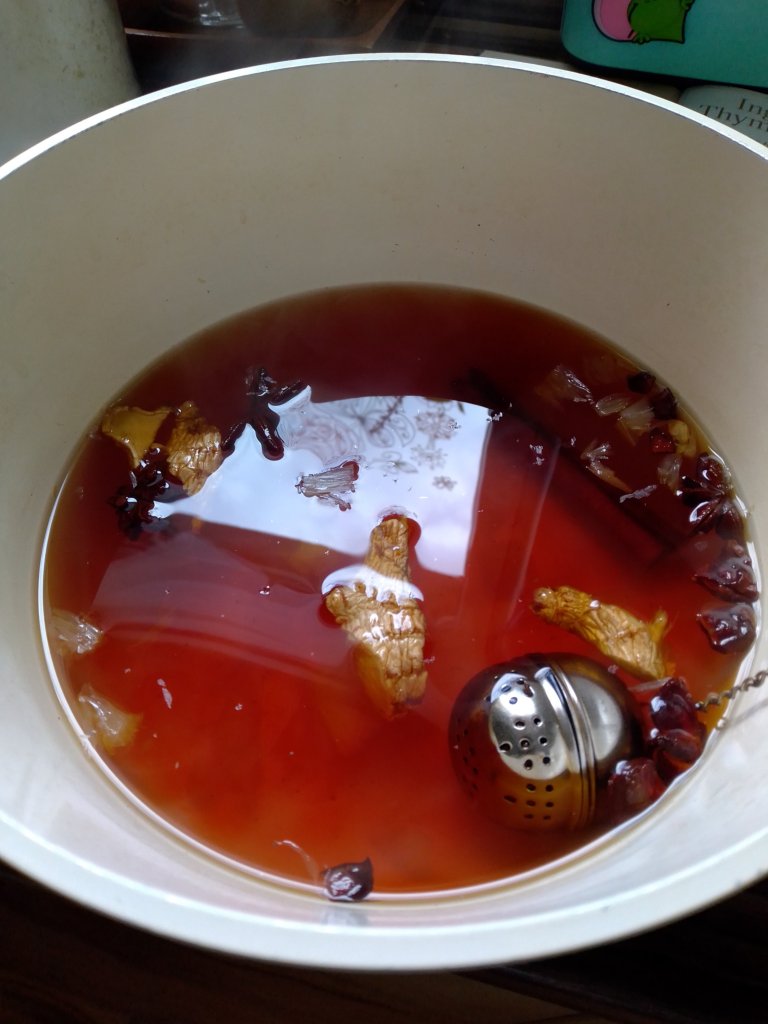 Nun war in den letzten Tagen so ein schönes Wetter und heute wieder elend kalt und windig. Aber das ist ja auch irgendwie super, dann kann ich wieder was drinnen machen, weil wir in den letzten Tagen ja immer draußen waren. Und weil es für mich noch viel gemütlicher ist, wenn ich einen guten Tee trinken kann, habe ich heute mal ein Rezept ausprobiert. Ein paar Stücken geschnittener Ingwer, Scheiben von 1 Zitrone (obwohl eine halbe auch reicht, jedenfalls nehme ich nächste Mal nur eine halbe), eine Zimtstange, 2 Aniststerne, 1 Teeei mit schwarzen Tee, 500ml Wasser und 350ml Apfelsaft. Alles erhitzen und ganz kurz aufkochen lassen.Dann absieben und ein Thymianzweiglein in die Tasse (den kann man aber auch weglassen) und fertig. Schmeckt ganz ausgezeichnet.